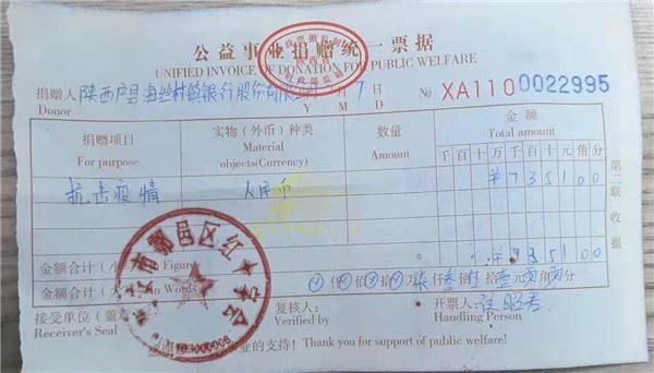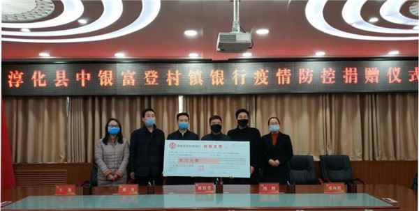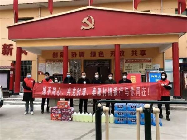 充分发挥党员干部先锋的模范作用,用实际行动彰显共产党员的使命与担当,行长带领全体党员干部主动向中共咸阳市渭城区党支部缴纳特殊党费3400元,全行员工主动为咸阳市渭城区红十字会捐款5600元,用实际行动为抗疫战争贡献一份微薄之力。还向战斗在防疫一线的社区工作人员赠送了价值2000元的水果、牛奶、面包。 --陕西蓝田中银富登村镇银行: