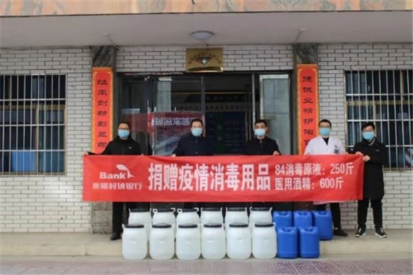 危难时刻,越显责任担当,该行支部书记、行长陈志忠一马当先,积极多渠道筹集防疫物资,并于2月8日将筹集到的600斤医用酒精、250斤84消毒原液第一时间捐赠给旬阳县医院,赢得了当地群众的赞誉,扩大了泰隆村镇银行的影响力。 --陕西泾阳泰隆村镇银行:
