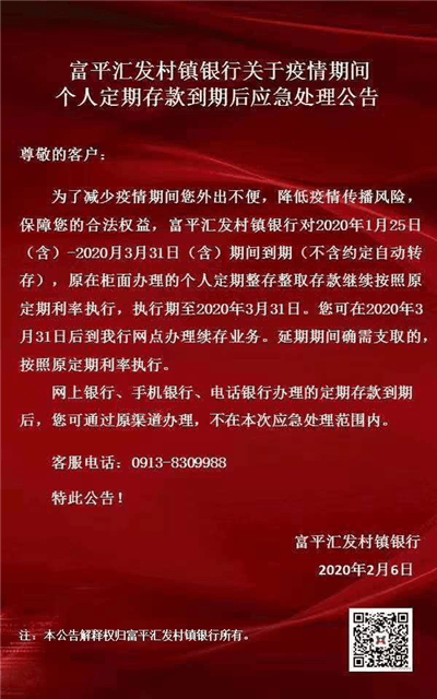 一、存款到期不用愁,富平汇发解您困 为了解决疫情期间客户外出不便,降低疫情传播风险,富平汇发村镇银行主动让利,针对2020年1月25日-2020年3月31日期间到期的定期存款,均按照原约定利率执行至2020年3月31日,延期期间确需要支取的,可随时进行支取。经统计,富平汇发村镇银行1月25日-3月31日到期定期存款共有528笔,金额合计5567.19万元,本次采取的延期措施将增加利息支出 13.7 万元。 二、贷款申请不用烦,富平汇发帮您忙 疫情期间,富平汇发村镇银行推出了微信公众号申请贷款功能,客户只需要关注微信公众号后,即可在相关模块提交贷款申请,后台收到客户申请后,第一时间与客户取得电话联系,了解客户贷款需求并制定具体的放贷方案。截止2020年2月18日,线上申请贷款共有18笔,金额合计187万元。 同时针对疫情期间到期的贷款,如客户还款不便或还款困难,富平汇发村镇银行将通过视频聊天、邮件等方式录制客户同意展期的申请视频,将电子相关资料作为信贷资料留存,及时在信贷系统为客户办理展期操作,延长客户贷款期限。 三、贷款逾期不用怕,富平汇发排您忧 为了响应国家防疫金融支持号召,凡参加新型冠状病毒疫情防控的医护人员、工作人员,以及确诊患者和疑似患者及其家属,在疫情防控期间因还款不便造成贷款逾期的,富平汇发村镇银行将对已发生的逾期不视为违约,不记罚息,同时积极与人民银行征信中心进行协调,保护客户征信,同时针对受疫情影响暂时失去收入来源的个人,结合其实际情况,及时与客户沟通调整还款计划,全力为客户纾困。 在疫情期间,富平汇发村镇银行按照“特事特办、急事急办”原则,线上调查、审批切实提高业务办理效率,针对疫情影响较大的批发零售、住宿餐饮、物流运输、建筑施工等行业,特别是民营小微企业,不抽贷、不断贷、不压贷。根据客户实际情况,积极采取展期、借新还旧、无还本续贷、变更还款计划等方式,支持贷款客户渡过难关,不断强化金融支持、用实际行动践行社会使命。