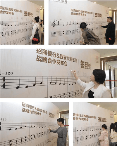 发布会前,双方领导和嘉宾在创意音符上签到,让签名与音符在五线谱上交融,汇聚成象征招商银行西安分行与西安交响乐团的未来乐章! 招商银行西安分行行长王晏蓉在致辞中表示,招商银行西安分行将以此次合作为契机,充分利用自身的专业优势、渠道优势、品牌优势,为促进陕西文化艺术事业发展作出更大贡献。 爱乐剧院管理有限公司总经理曹彦,结合双方行业优势和对音乐艺术工作所做出的贡献进行了介绍,并对招商银行西安分行与西安交响乐团的战略合作给予肯定。 招商银行西安分行零售金融事业部但昭总经理、西安交响乐团的品牌总监曹继文先生、客户代表罗琦先生依次发言,共祝双方紧密合作、越来越好! 仪式上,招商银行西安分行和西安交响乐团双方领导一同将象征合作新篇章的音符拼入曲谱,共同启动“音您而变,乐响长安”活动。