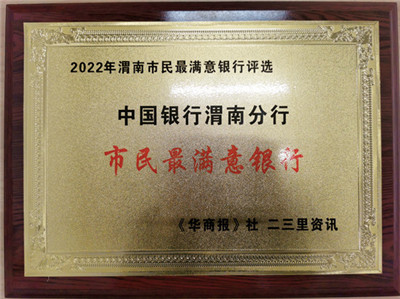 3月1日,由华商渭南全媒体中心联合渭南城区11家银行,共同举办的2022年渭南市民最满意银行评选活动已圆满结束。本次活动万余人次参与投票以及银行评审团走访打分,最终中行渭南分行综合得分第一,荣获“2022年市民最满意银行”荣誉称号。