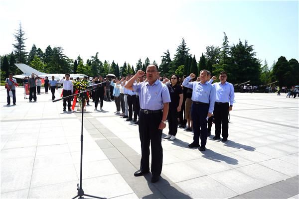 在“扶眉战役烈士永垂不朽”的纪念碑前,活动正式拉开帷幕,赵乾军同志主持开幕式,党宏明、樊丽同志分别致辞。全体人员在纪念碑前高举右拳,庄严宣誓,重温入党誓词;共同为在全国解放战争西北战场上最大一次战役——扶眉战役中牺牲的3000多名解放战士行默哀礼。两支部书记代表全体人员向烈士共同敬献花篮,致敬历史,致敬先烈。